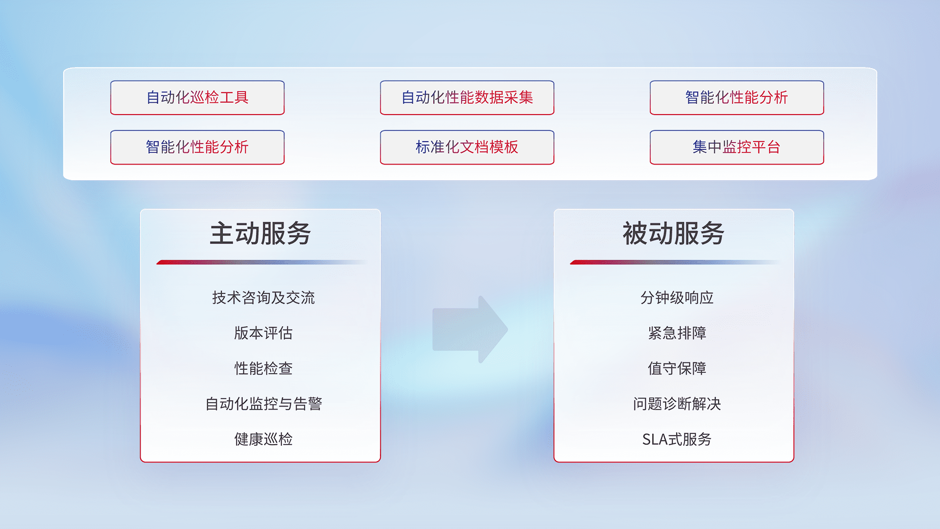 智能化工具和标准化文档,,保障服务质量,,提供主动服务(包含技术咨询、、、版本评估、、、、性能检查、、、自动化监控与告警、、、健康巡检)和被动服务包含(分钟级响应、、紧急排障、、、值守保障、、、、问题诊断解决、、SLA服务)。。